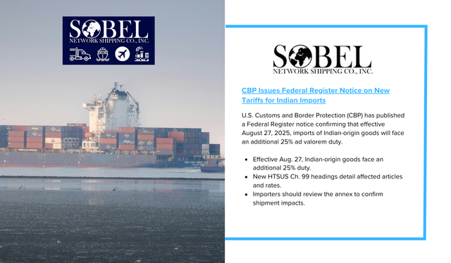 U.S. Customs and Border Protection (CBP) has published a Federal Register notice outlining new tariff measures affecting imports from India. The notice specifies that, effective August 27, 2025, Indian-origin goods