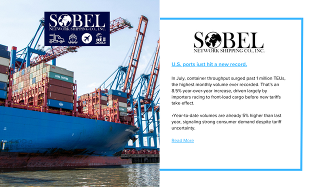 U.S. ports recorded unprecedented container volumes in July, marking the busiest month on record as importers accelerated shipments to stay ahead of looming tariff deadlines. More than 1 million twenty-foot