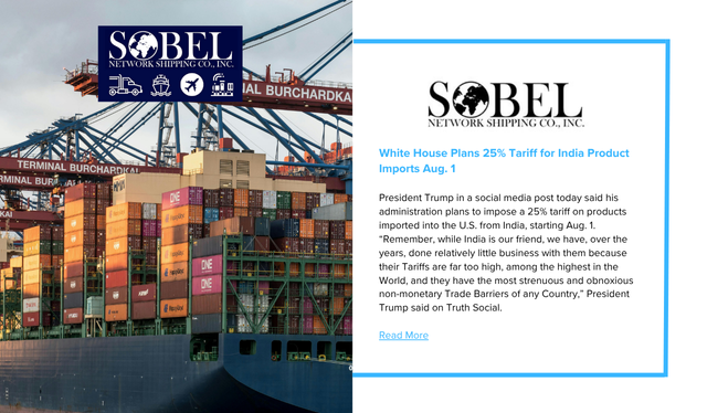 White House Plans 25% Tariff for India Product Imports Aug. 1 President Trump in a social media post today said his administration plans to impose a 25% tariff on products
