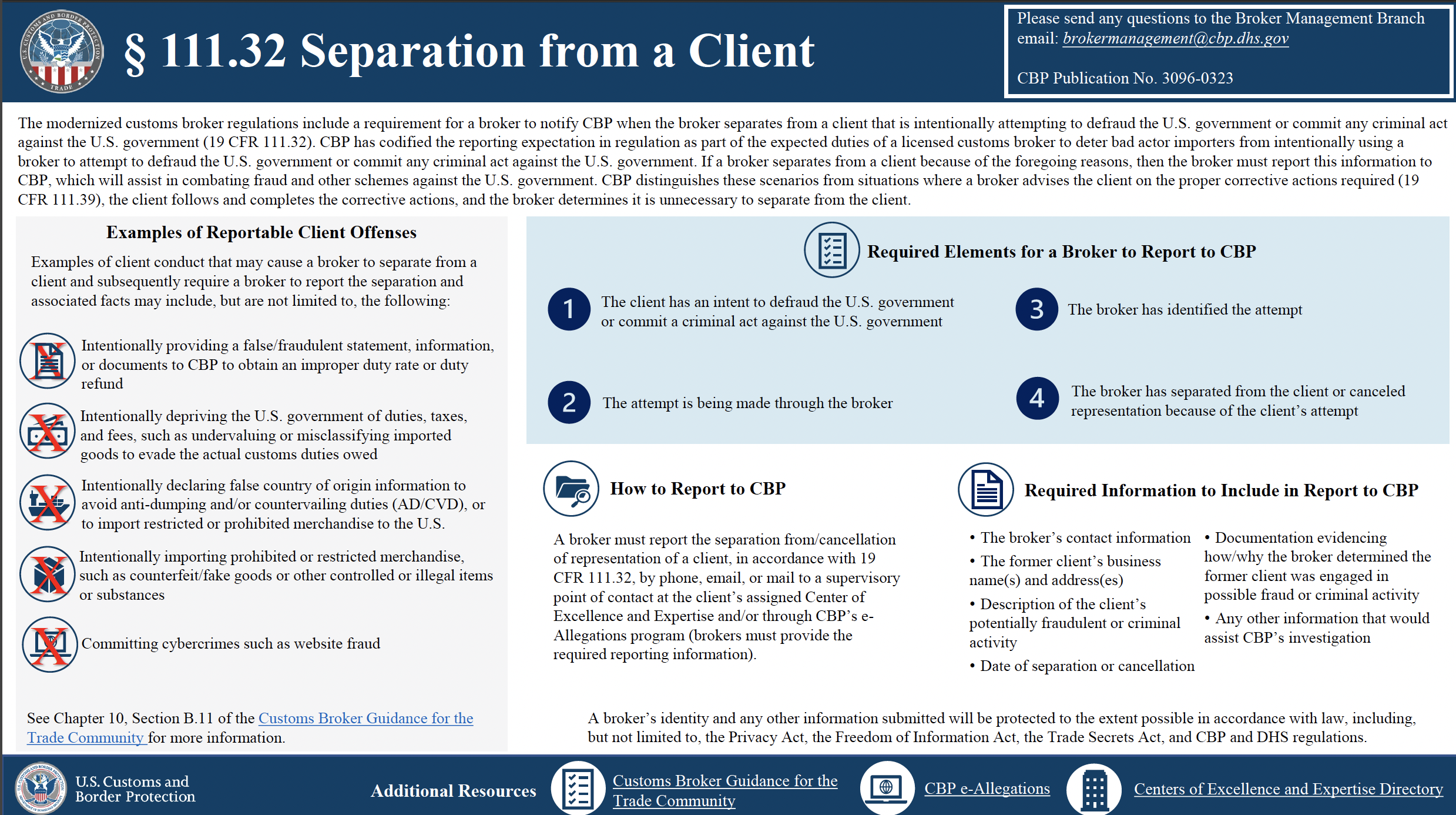 Importantly, the broker’s decision to separate from a client for business reasons not related to a fraud on the U.S. Government does not have to be reported to CBP under the regulation. However, the broker is prohibited from submitting any false or misleading information to the U.S. Government.