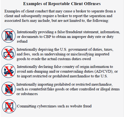 It is worth noting that CBP distinguishes these scenarios from situations where the broker provides the client with a corrective action plan, which is followed, and the broker determines that there is no need to separate from the client. CBP assures that it will protect the broker’s identity to the extent possible. Additionally, the regulation covers any fraud or criminal act against the U.S Government, not just CBP, and it is not limited to customs offenses.