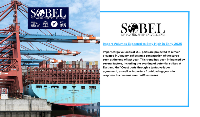 Import cargo volumes at U.S. ports are projected to remain elevated in January, reflecting a continuation of the surge seen at the end of last year. This trend has been influenced by several factors, including the averting of potential strikes at East and Gulf Coast ports through a tentative labor agreement, as well as importers front-loading goods in response to concerns over tariff increases.