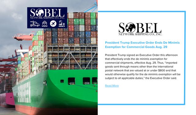 President Trump signed an Executive Order this afternoon that effectively ends the de minimis exemption for commercial shipments, effective Aug. 29. Thus, “imported goods sent through means other than the international postal network that are valued at or under $800 and that would otherwise qualify for the de minimis exemption will be subject to all applicable duties,” the Executive Order said.