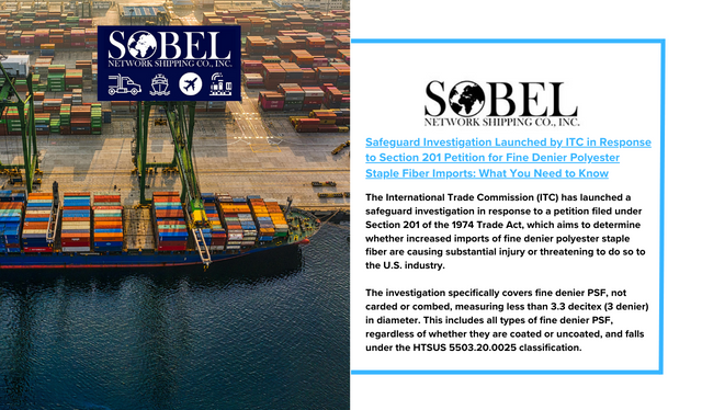 The International Trade Commission (ITC) has launched a safeguard investigation in response to a petition filed under Section 201 of the 1974 Trade Act, which aims to determine whether increased imports of fine denier polyester staple fiber are causing substantial injury or threatening to do so to the U.S. industry.