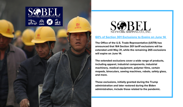 The Office of the U.S. Trade Representative (USTR) has announced that 164 Section 301 tariff exclusions will be extended until May 31, while the remaining 265 exclusions will expire on June 14.