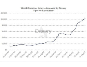 The trend in ocean freight rates has had – persistently – only one direction for the past fourteen months or so and that has been *up*. This chart from Drewry tells the tale: