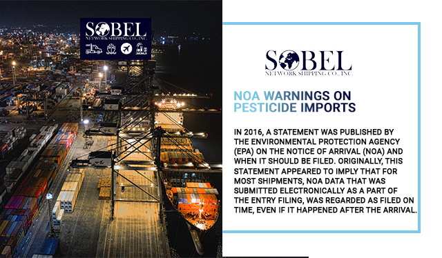 In 2016, a statement was published by the Environmental Protection Agency (EPA) on the Notice of Arrival (NOA) and when it should be filed. Originally, this statement appeared to imply that for most shipments, NOA data that was submitted electronically as a part of the entry filing, was regarded as filed on time, even if it happened after the arrival of the shipment. Such was the belief of most customs brokers for the past six years.