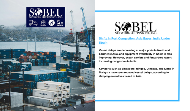 Vessel delays are decreasing at major ports in North and Southeast Asia, and equipment availability in China is also improving. However, ocean carriers and forwarders report increasing congestion in India.