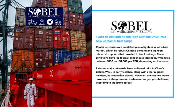 Container carriers are capitalizing on a tightening intra-Asia market, driven by robust Chinese demand and typhoon-related disruptions that have led to blank sailings. These conditions have led to peak season rate increases, with hikes between $100 and $1,000 per TEU, depending on the route.